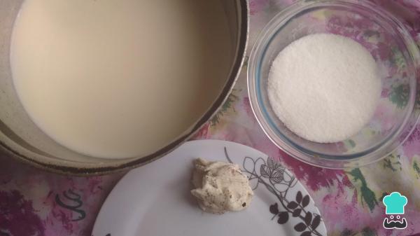 Divida o leite em duas partes iguais: coloque 100 ml numa tigela e 275 ml numa panela pequena.